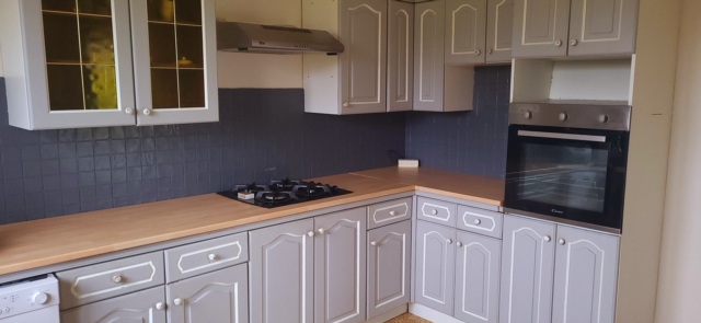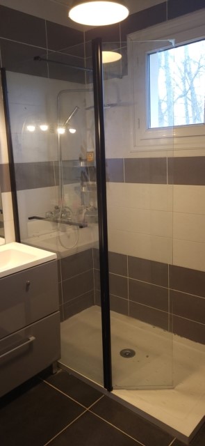 Une entrée desservant un séjour/salon de 32 m² avec poêle à granulés et balcon permettant un accès direct au jardin, une cuisine aménagée et équipée de 11 m², placard, wc indépendant, une salle d’eau avec douche à l’italienne.