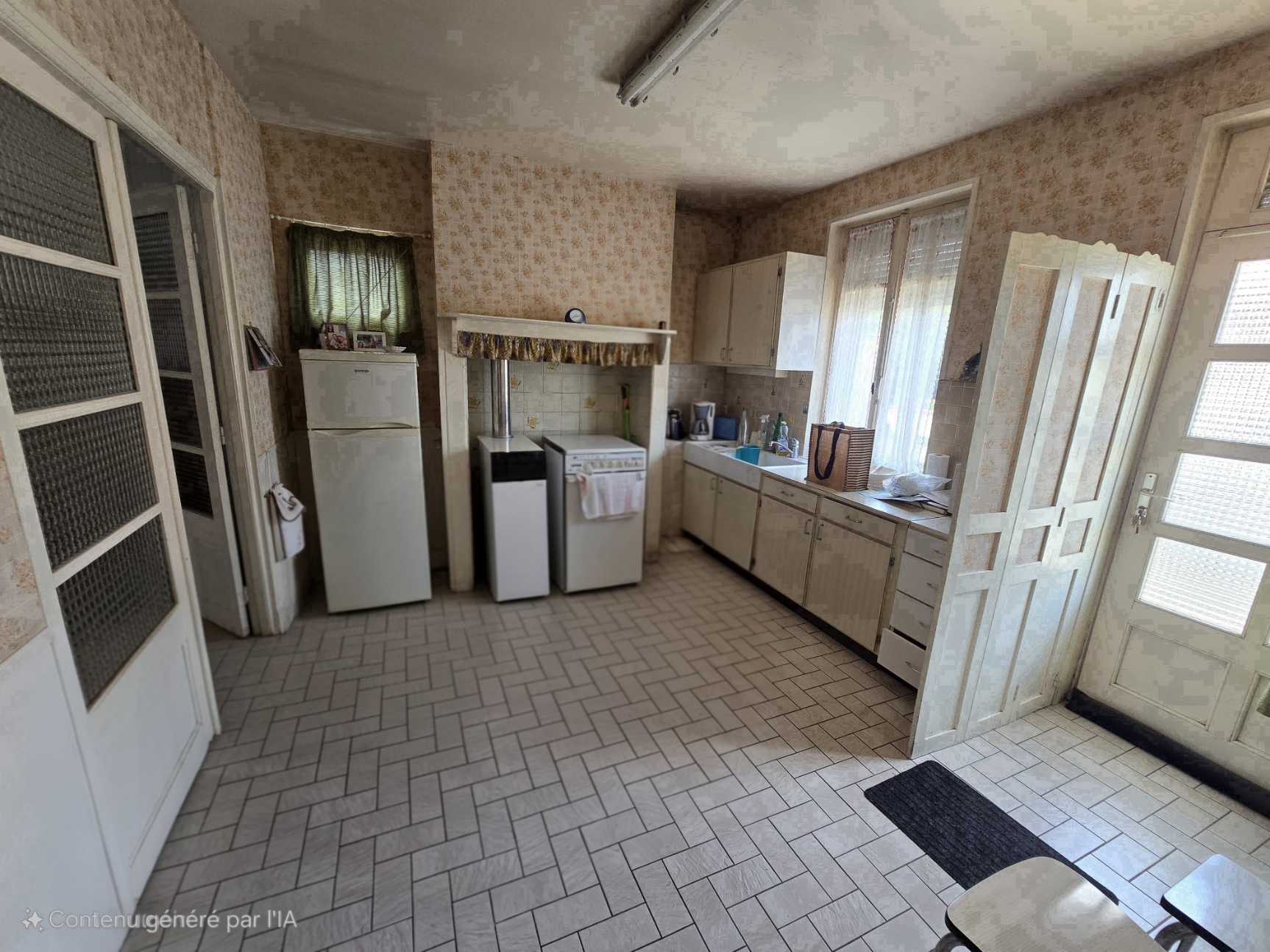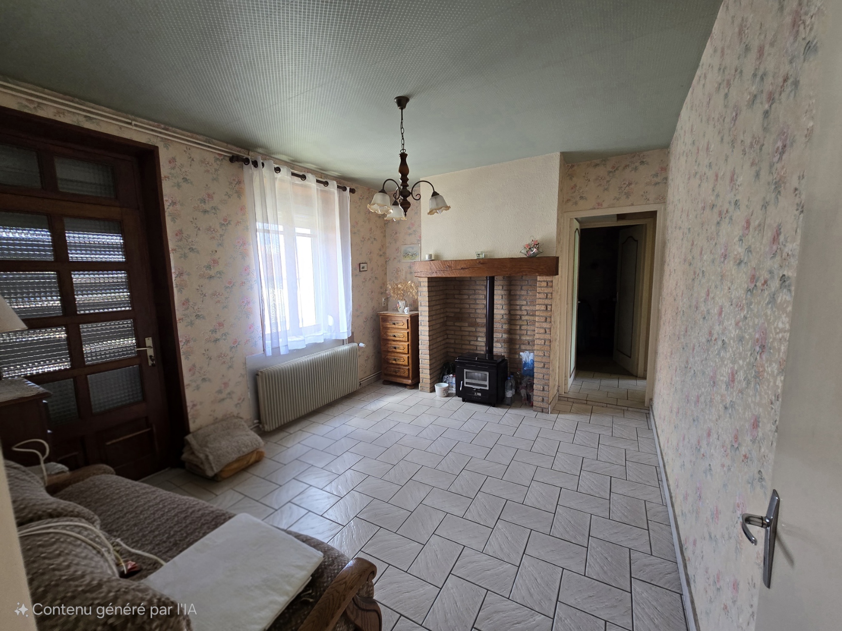 Au rez-de-chaussée : Séjour/salon avec poêle à charbon, un espace TV ou bibliothèque, cuisine indépendante, deux chambres, une salle de bain et wc séparés.
