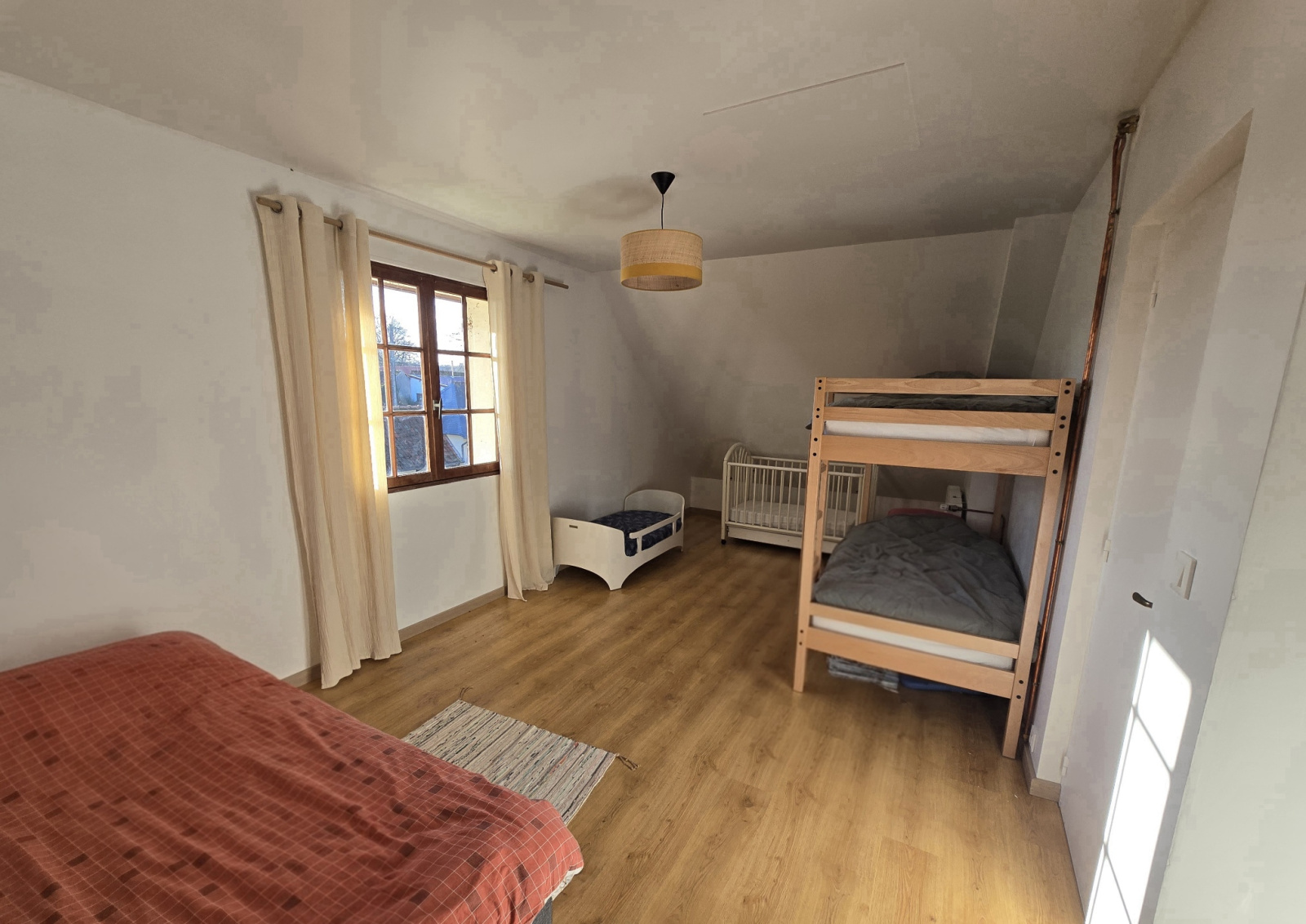 A l'étage : deux grandes chambres avec placards intégrés, et une troisième grande chambre à terminer.